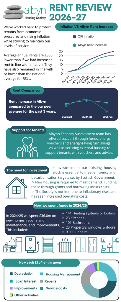 Albyn’s 2026-27 Rent Consultation is now live until 15th January. To participate, you will have received a survey either through a link sent to you by email or text. Alternatively, if you have requested postal surveys, you will have received a paper copy of the consultation report, along with a survey sheet and prepaid reply envelope. If you have received a digital copy of the survey and would like to request a paper copy, please email Finance.Enquiries@albynhousing.org.uk or call us on 0300 323 0990.